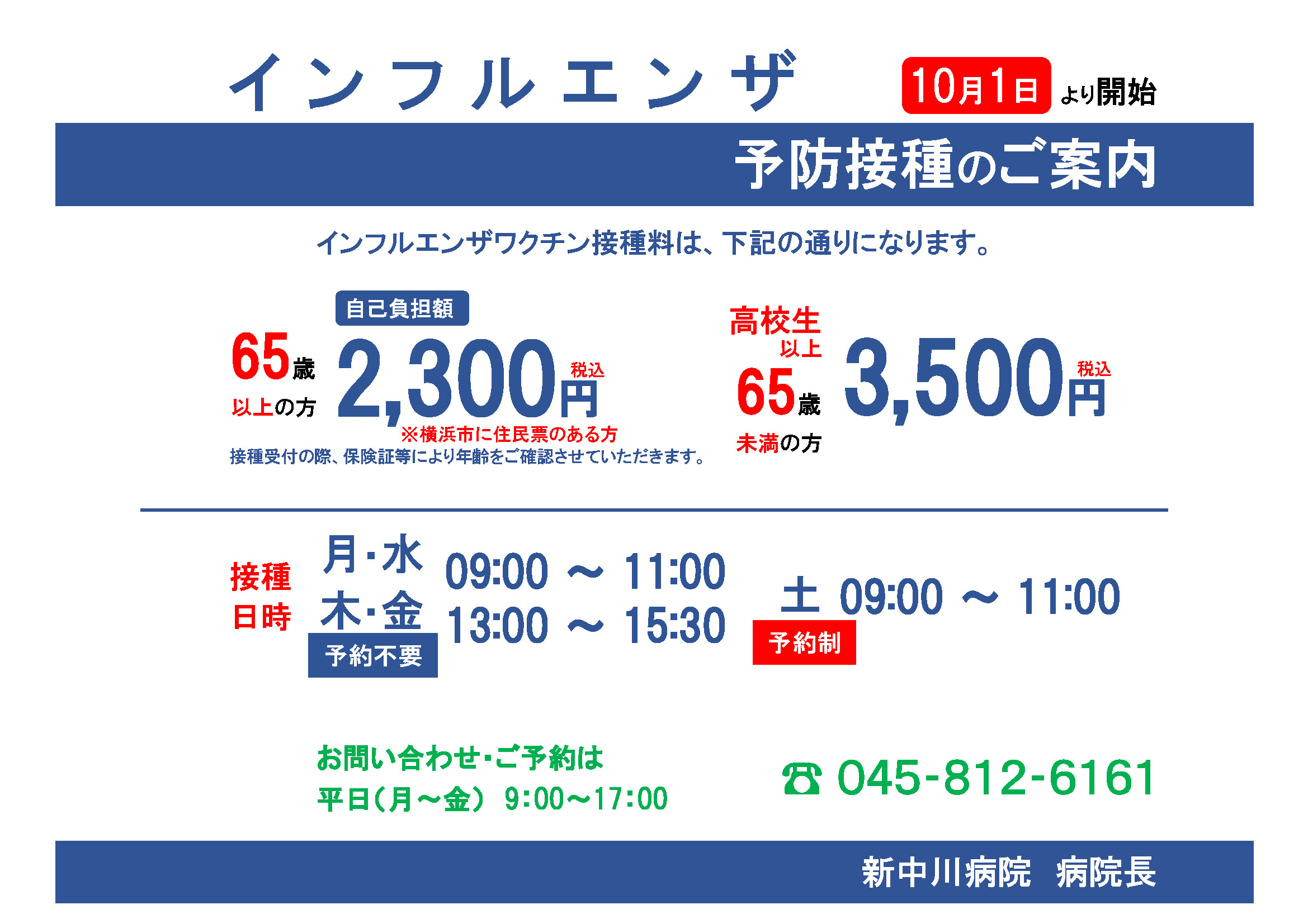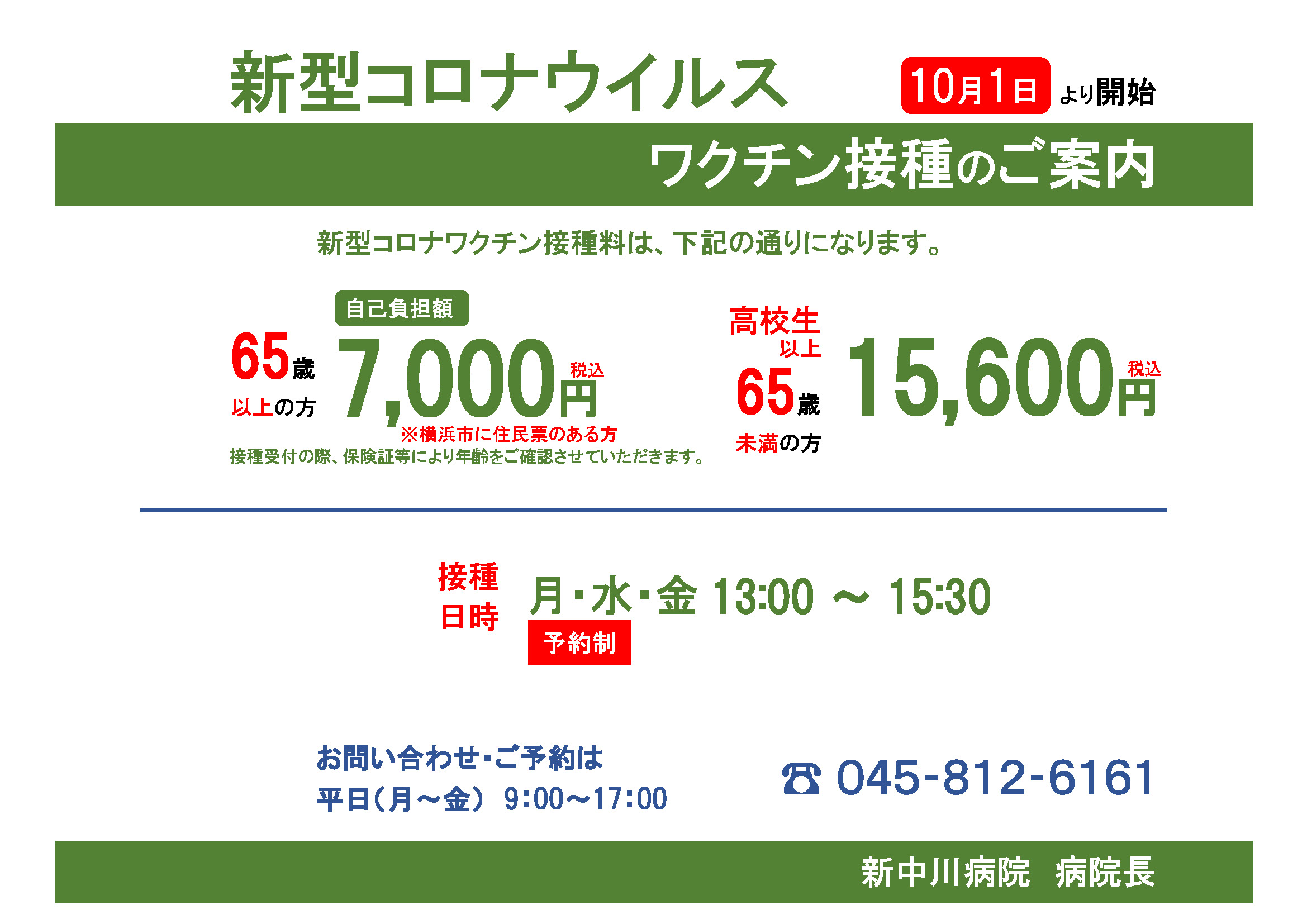 新型コロナワクチン接種を10月1日より予約を開始いたします。